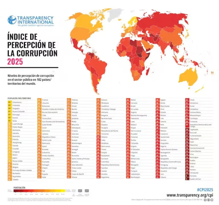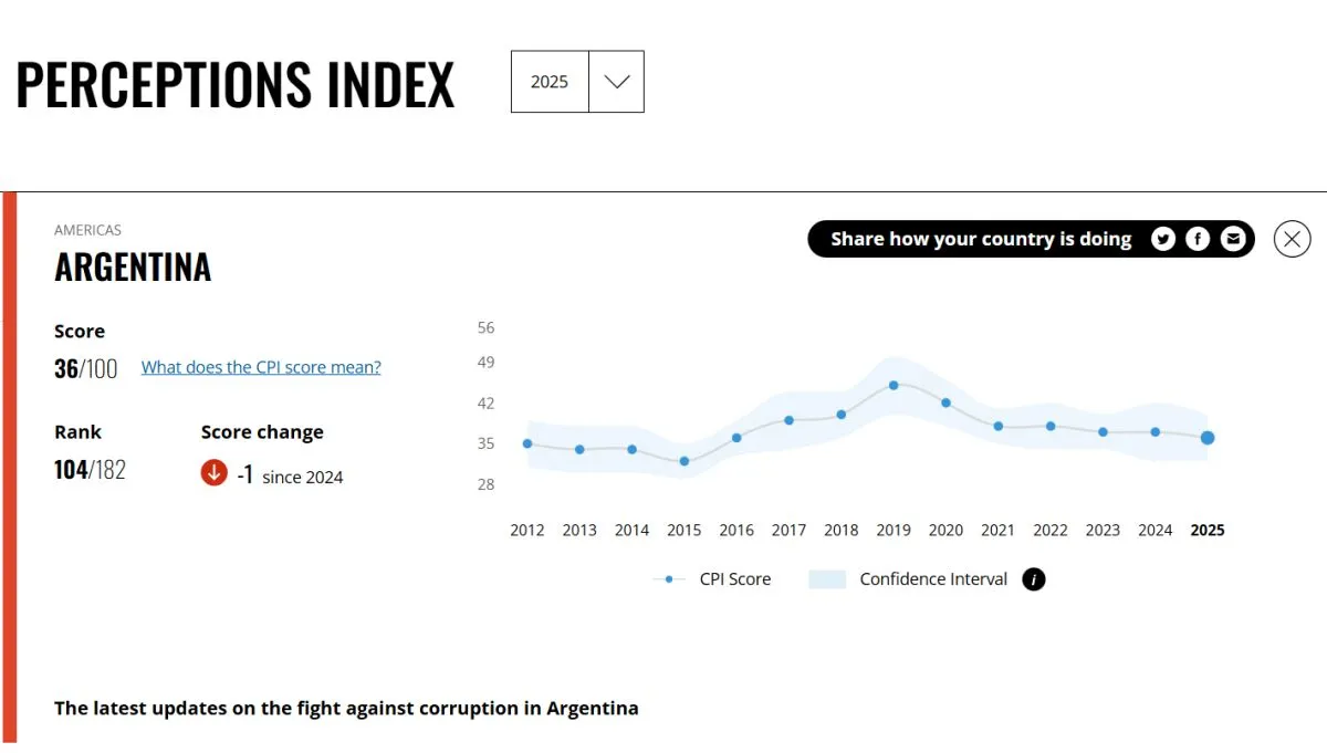 La Argentina libertaria registró un aumento de los casos de corrupción a lo largo de 2025, según indica el ranking mundial de transparencia elaborado por la organización no gubernamental Transparencia Internacional. En el segundo año de mandato de Javier Milei, el Índice de Percepción de la Corrupción (IPC) que elabora la entidad con sede en Berlín (Alemania), precisa que nuestro país bajó del puesto 99 al 104, en un informe que clasifica 182 países del mundo. En ese puesto, la Argentina comparte el lugar con Belice y Ucrania, y está detrás de países como Zambia, Lesoto, Gambia y República Dominicana. Dinamarca, Finlandia y Singapur encabezan el listado y Venezuela, Somalía y Sudán del Sur son considerados los países más corruptos del mundo. Con una calificación de 36 sobre 100 (donde 0 es “altamente corrupto” y 100 “muy transparente”), el puntaje del país viene bajando desde 2019, cuando ocupaba el lugar 66 sobre 180 países analizados. El Índice de Percepción de la Corrupción (IPC) es la clasificación global de corrupción más utilizada en el mundo, ya que mide el grado de “corrupción percibida” por expertos y empresarios en el sector público de cada país. La puntuación de cada país es una combinación de al menos tres fuentes de datos extraídas de encuestas y evaluaciones de corrupción diferentes. Estas fuentes de datos son recopiladas por diversas instituciones de prestigio, como el Banco Mundial y el Foro Económico Mundial. Para Transparencia Internacional la corrupción “puede manifestarse de diversas formas, desde actos delictivos como el soborno, la extorsión y la malversación de fondos, hasta prácticas altamente cuestionables, pero a veces legales, como el nepotismo, el clientelismo y el favoritismo”.