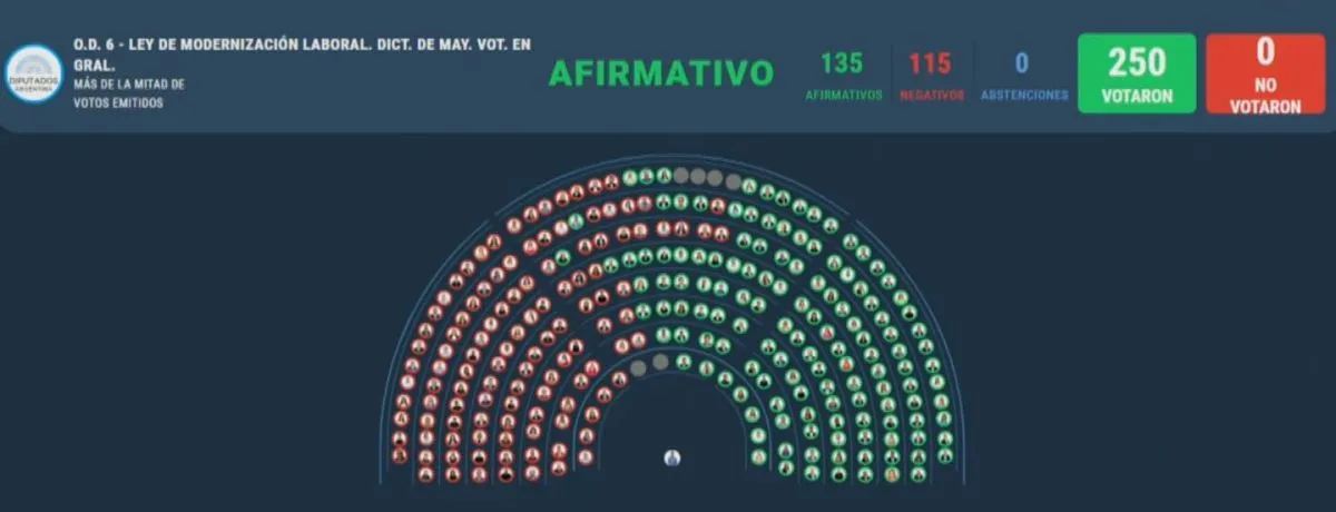 La Cámara de Diputados de la Nación aprobó en la madrugada de este viernes la reforma laboral con 135 votos a favor, 115 en contra y 0 abstenciones. El proyecto acorta distancias hacia su sanción definitiva, pero por los cambios y ajustes realizados en la Cámara baja deberá volver a la Cámara alta para su revisión.
