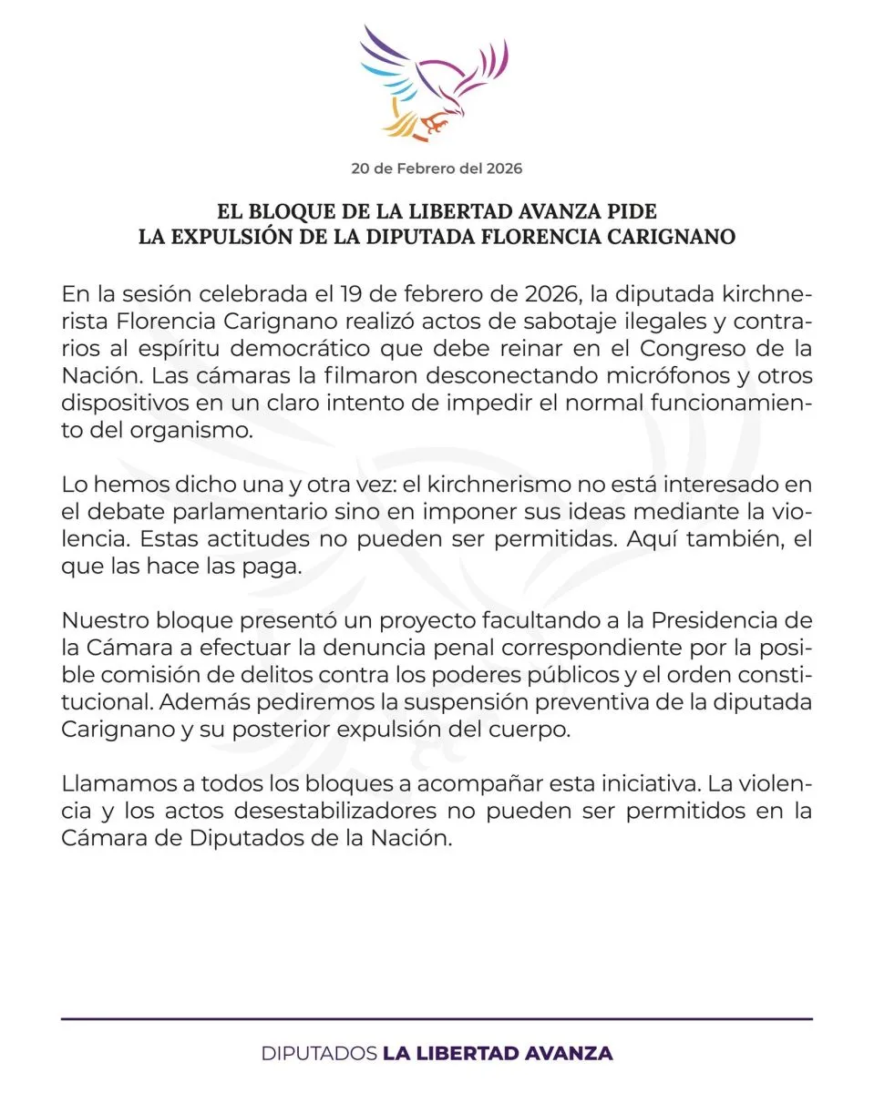La tensión por el debate de la reforma laboral no terminó con la votación. Luego de la aprobación del proyecto en la Cámara de Diputados, el bloque de La Libertad Avanza avanzó con un pedido formal para expulsar a Florencia Carignano, a quien responsabiliza por haber interrumpido el desarrollo de la sesión al manipular los dispositivos de sonido y el sistema de registro taquigráfico.