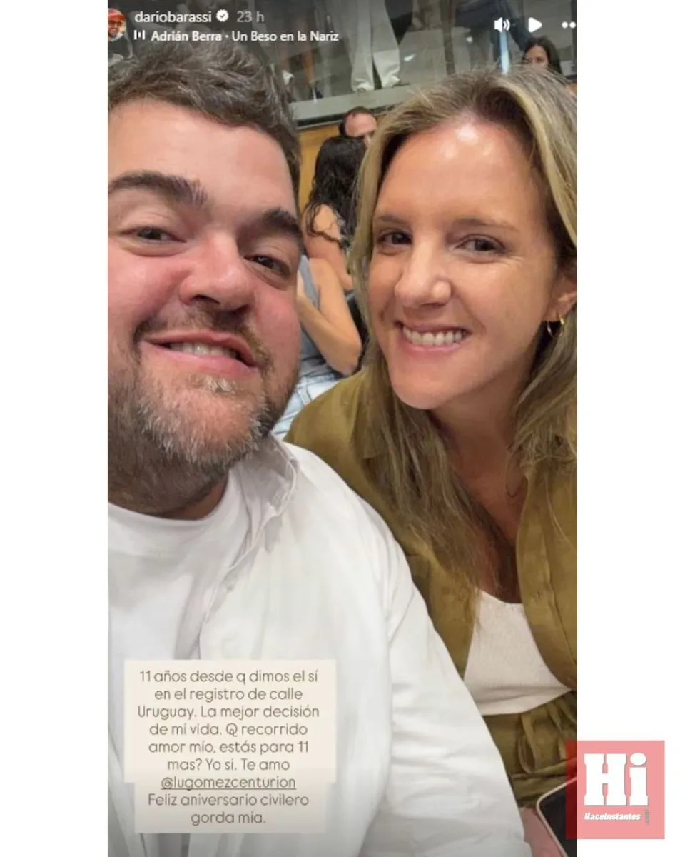 “11 años desde que dimos el sí en el registro de la calle Uruguay. La mejor decisión de mi vida. Que recorrido amor mío, ¿estás para 11 más? Yo sí. Te amo Lu Gómez Centurión. Feliz aniversario civilero gorda mía”, escribió Barassi en sus stories, musicalizando el posteo con “Un beso en la nariz”, de Adrián Berra. En la imagen se los veía radiantes el día de su casamiento civil, ambos vestidos de blanco. Luego sumó otra postal del recuerdo, acompañada por “This is Love” de Sly & The Family Stone, donde reflexionó con humor: “11 años gorda mía. Qué locura, y que flaco lpm”.