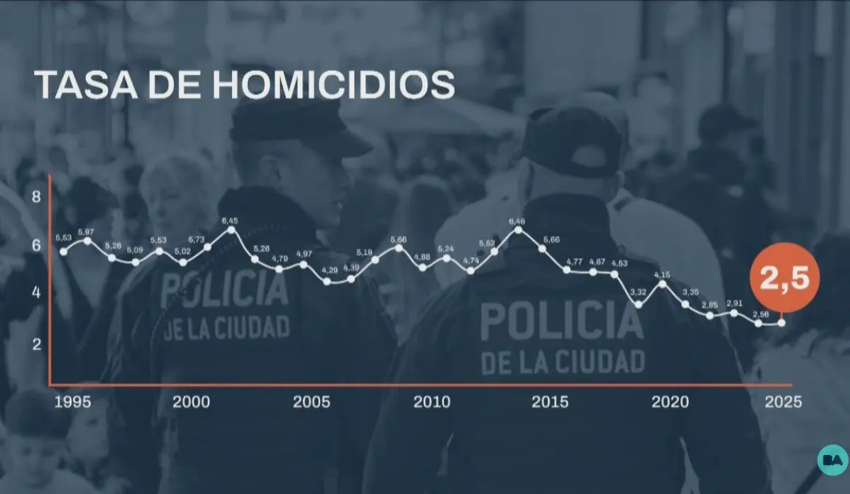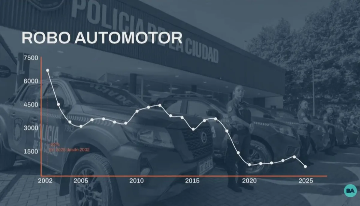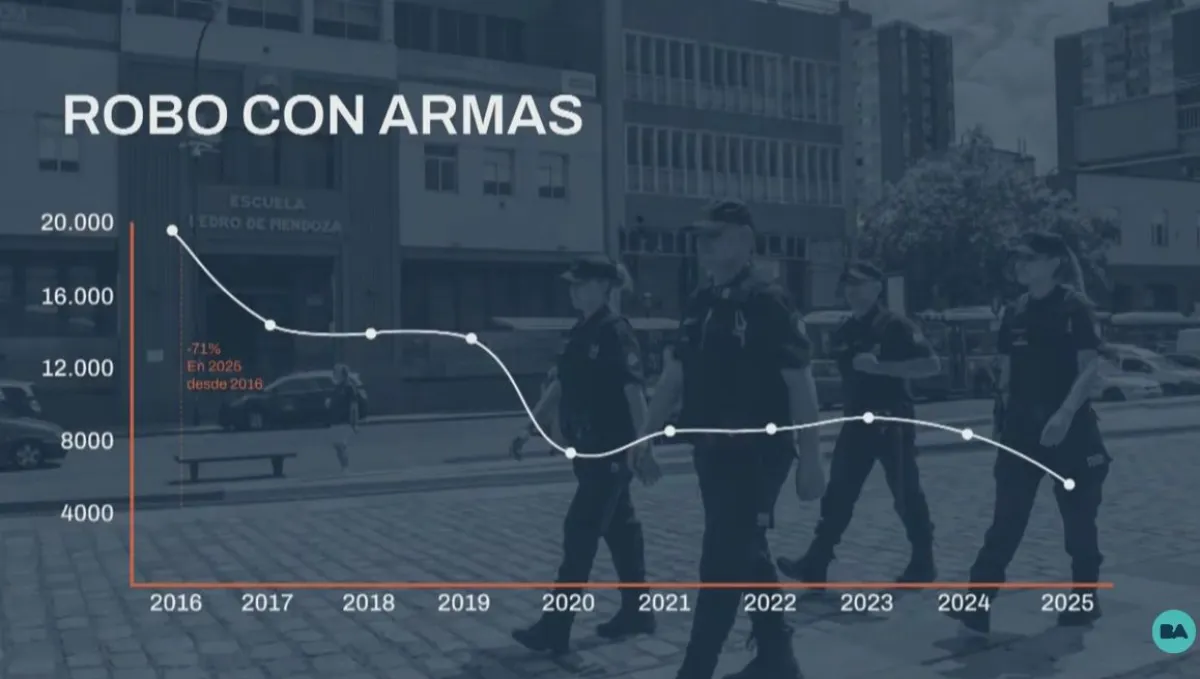 “En el 2025, bajamos todos los delitos de la Ciudad: los homicidios, el robo automotor y el robo con mano armada están en el nivel más bajo de la historia de la Ciudad de Buenos Aires. Nunca habíamos visto algo así. Los homicidios alcanzaron su piso con 2,5 casos cada 100 mil habitantes. El segundo son los robos totales que cayeron un 27% respecto al año anterior, el automotor cayó 54% respecto que en el 2024. Los robos con arma descendieron un 34% respecto del año pasado”, remarcó.