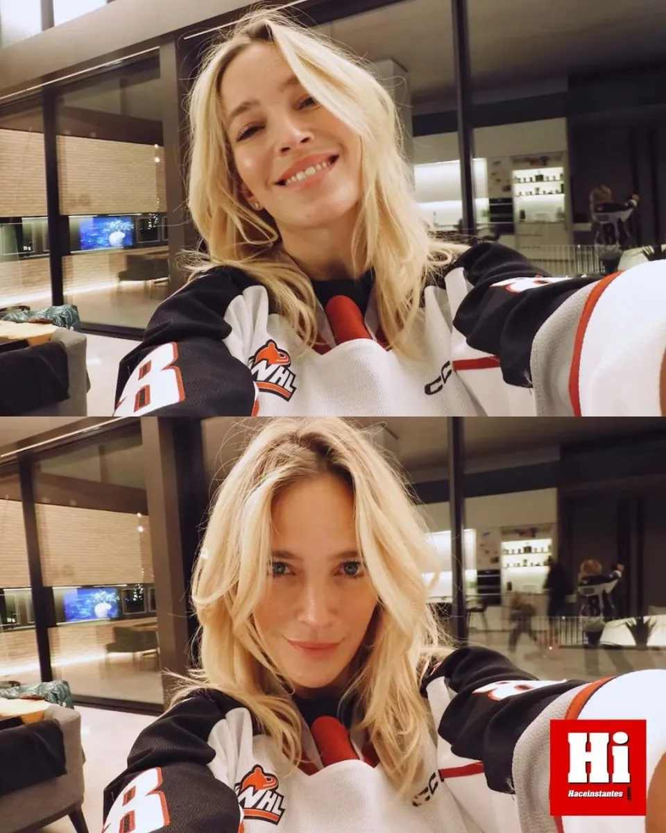 En las fotografías se la vio relajada y sonriente, luciendo la camiseta oficial del equipo, con el número 18 y los clásicos colores negro, rojo y blanco, tanto en la intimidad de su hogar como en el estadio. En una de las postales, posó frente a los amplios ventanales de su casa; en otra, ya ubicada en una tribuna con vista privilegiada a la pista de hielo, compartió risas con uno de sus hijos. Las imágenes reflejan no solo su fanatismo por el hockey, sino también la complicidad familiar que caracteriza cada salida.