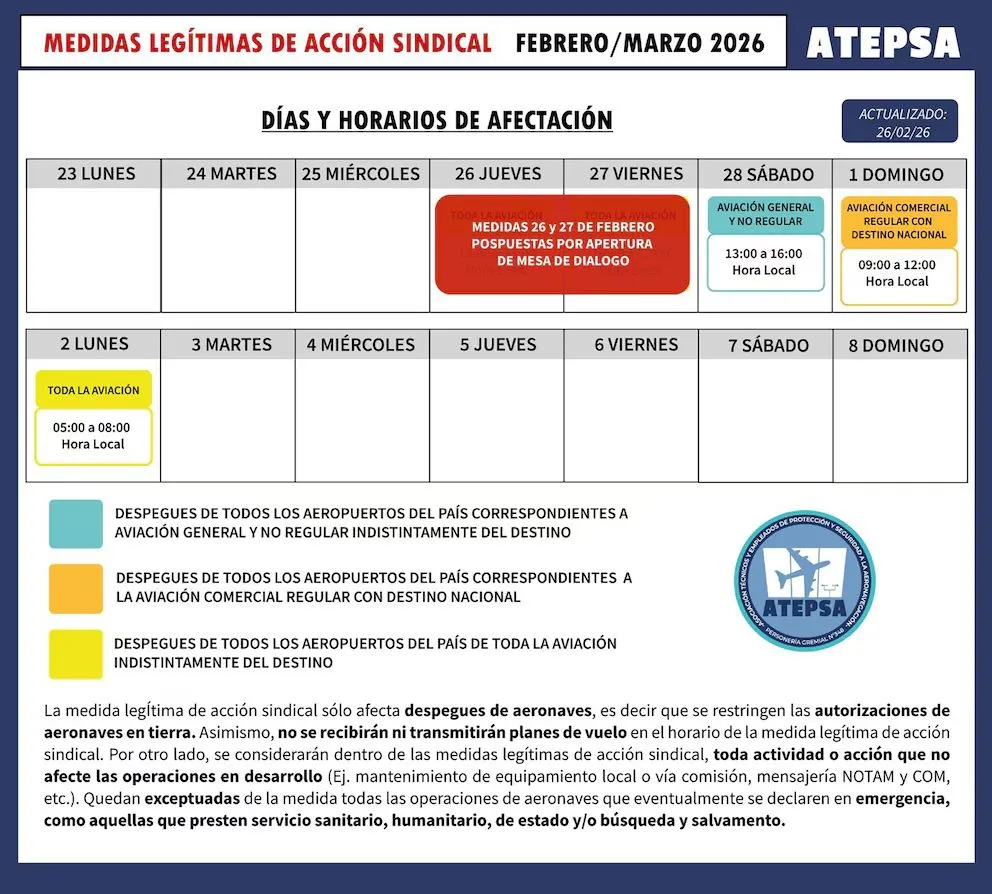 La Asociación Técnicos y Empleados de Protección y Seguridad a la Aeronavegación (Atepsa), el gremio que reúne a los controladores aéreos, levantó los paros para este jueves 26 y viernes 27 de febrero.