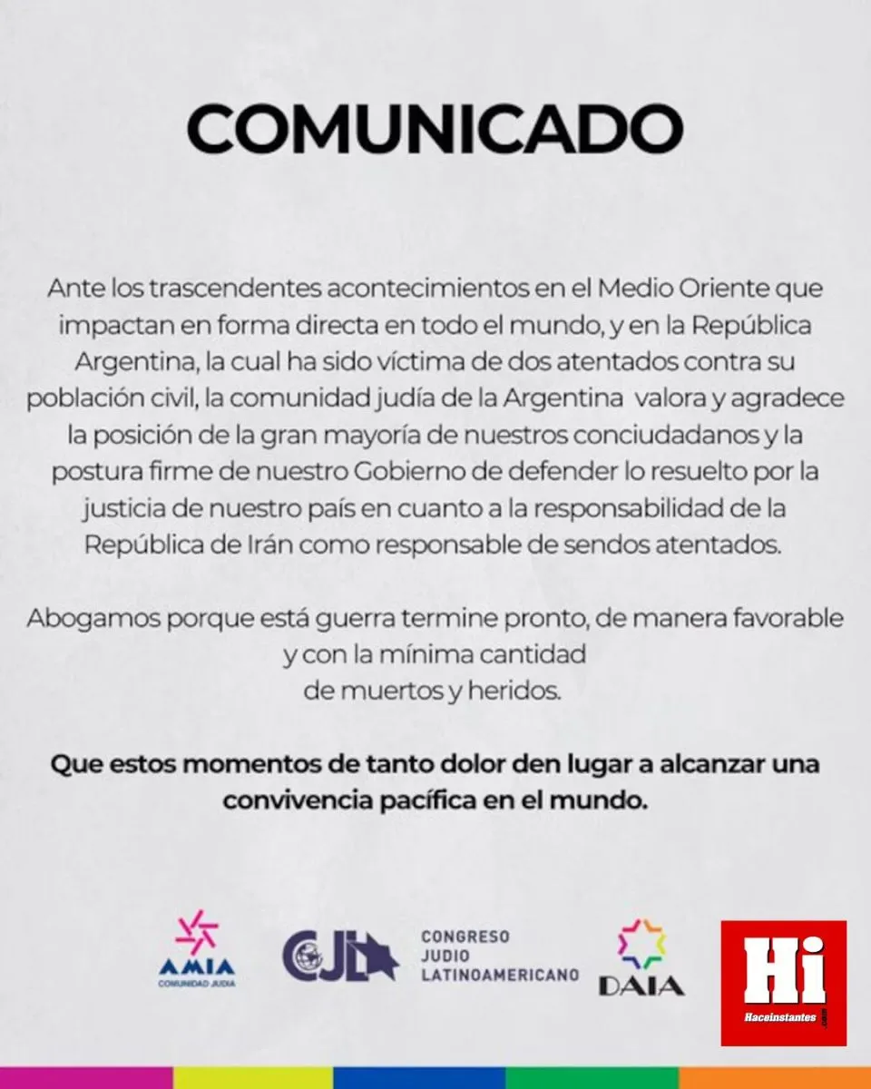 En el texto difundido, la organización subrayó: “La comunidad judía de la Argentina valora y agradece la posición de la gran mayoría de nuestros conciudadanos y la postura firme de nuestro Gobierno de defender lo resuelto por la justicia de nuestro país en cuanto a la responsabilidad de la República de Irán como responsable de sendos atentados”. Asimismo, en medio de la creciente tensión en Medio Oriente, expresaron: “Abogamos porque esta guerra termine pronto, de manera favorable y con la mínima cantidad de muertos y heridos” y añadieron: “Que estos momentos de tanto dolor den lugar a alcanzar una convivencia pacífica en el mundo”.