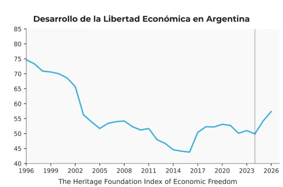 La Argentina avanzó 18 puestos en el Índice Mundial de Libertad Económica elaborado por la Heritage Foundation, logrando uno de los progresos más importantes de los últimos años. El país alcanzó un puntaje de 57,4, lo que implica un incremento de 3,2 puntos respecto a la medición anterior. Este avance representa el salto más significativo registrado a nivel global en la edición actual del ranking.