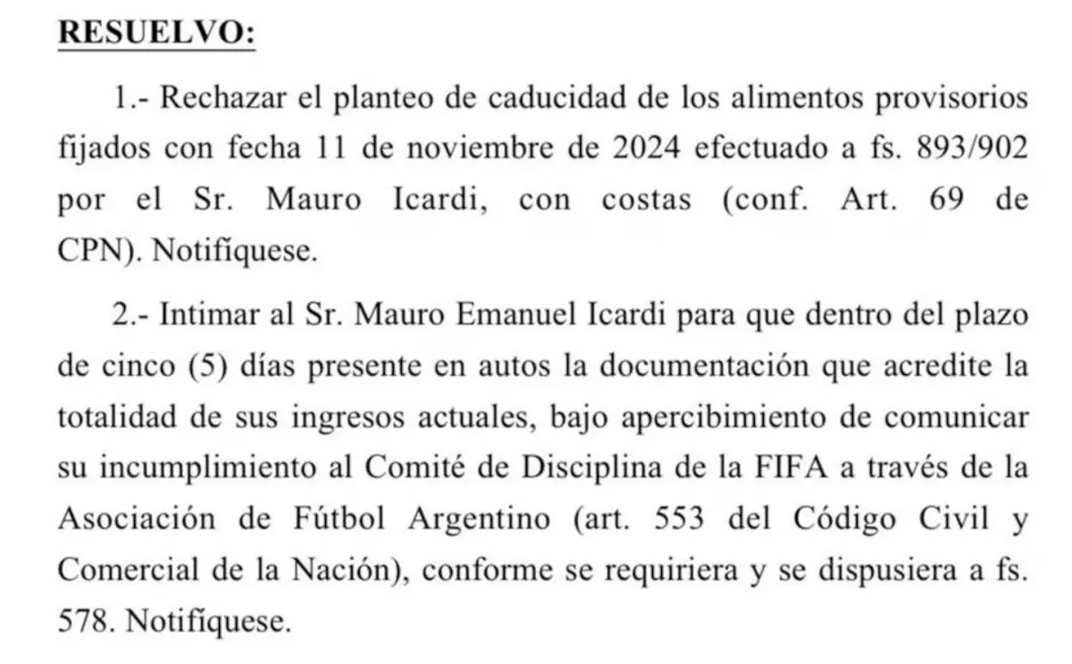 La batalla judicial entre Mauro Icardi y Wanda Nara sumó un nuevo capítulo. En las últimas horas se conoció que la Justicia tomó una resolución en el expediente por la cuota alimentaria de las dos hijas que tienen en común, lo que representó un revés para el delantero.