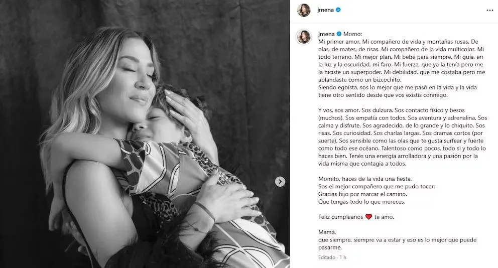 La actriz y cantante Jimena Barón volvió a emocionar en redes sociales al dedicarle un sentido mensaje a su hijo Morrison, conocido como “Momo”, en el día de su cumpleaños. A través de un posteo acompañado por imágenes inéditas y recuerdos familiares, la artista celebró los 12 años del niño y reflexionó sobre el vínculo que los une.