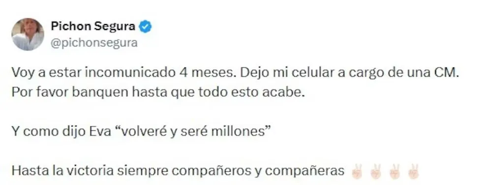 Antes de ser trasladado al penal de Benjamín Paz, Segura publicó un mensaje en sus redes sociales en el que se refirió a su situación judicial y aseguró que permanecerá incomunicado durante el tiempo que dure la medida. “Voy a estar incomunicado 4 meses. Dejo mi celular a cargo de una CM. Por favor banquen hasta que todo esto acabe”, escribió.