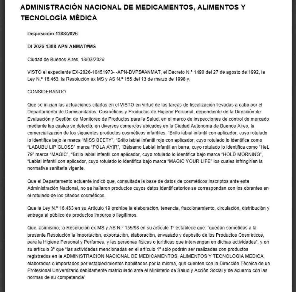 Allí se dispuso la prohibición del "uso, comercialización, distribución y publicidad en todo el territorio nacional de los siguientes productos cosméticos infantiles: 'Brillo labial infantil con aplicador, cuyo rotulado lo identifica bajo la marca MISS BEETY', sin datos de inscripción sanitaria; 'Brillo labial infantil rojo con aplicador, cuyo rotulado lo identifica como LABUBU LIP GLOSS' marca 'POLA AYIR', sin datos de inscripción sanitaria; 'Bálsamo Labial infantil en barra, cuyo rotulado lo identifica como HeL 79 marca MAGIC', sin otros datos de inscripción sanitaria; 'Brillo labial infantil con aplicador, cuyo rotulado lo identifica bajo marca HOLD MORNING', sin datos de inscripción sanitaria; Labial infantil con aplicador, cuyo rotulado lo identifica bajo marca 'MAGIC YOUR LIFE', sin datos de inscripción sanitaria".
