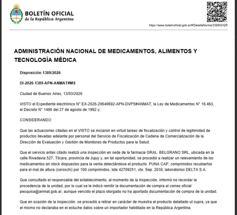 Por su parte, a través de la disposición 1389/2026, ordenaron la prohibición del uso, comercialización y distribución en todo el territorio nacional de todos los lotes y presentaciones del producto “PUNACAP comprimidos recubiertos para el mal de altura (SOROJCHI)”, elaborado por Laboratorios DELTA S.A., hasta que obtenga las autorizaciones sanitarias pertinentes.