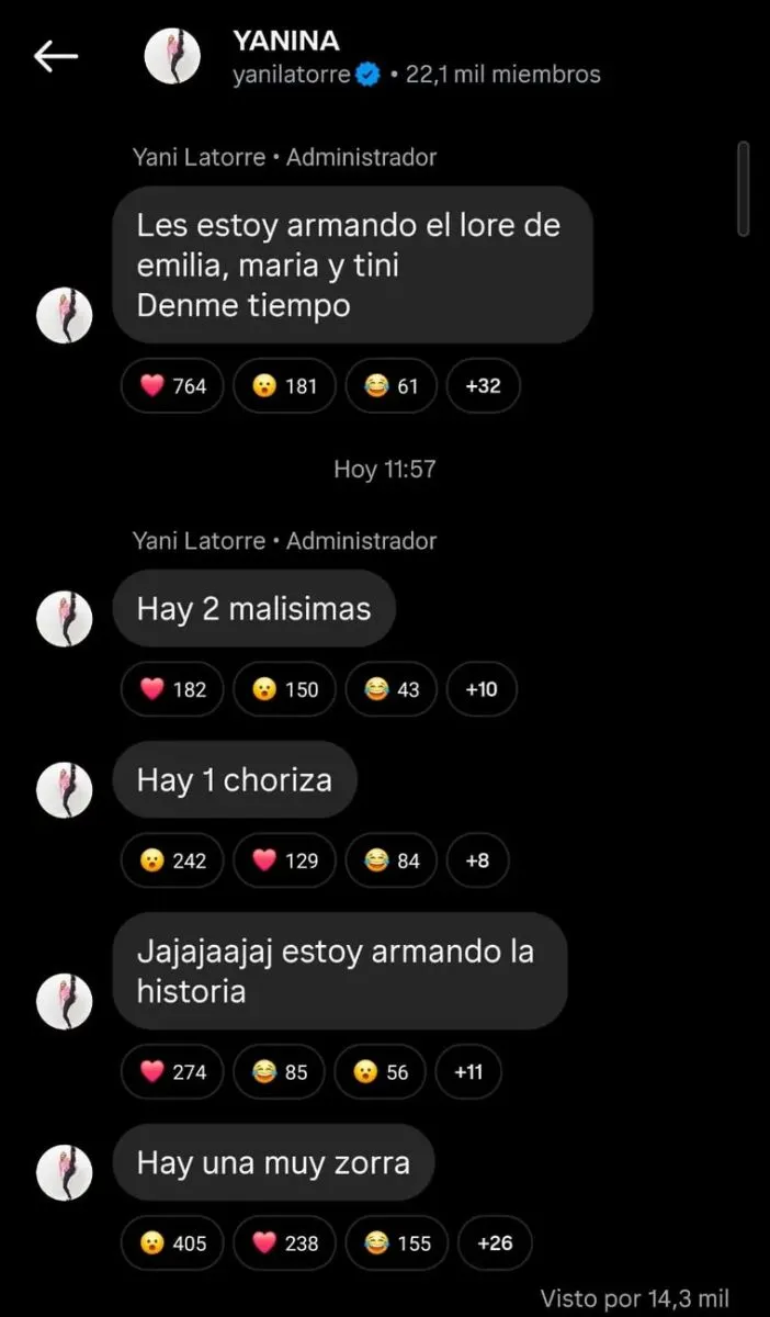 Lejos de bajar el tono, Yanina también dejó frases aún más picantes que anticipan nuevas revelaciones: “Hay dos malísimas, hay una choriza jajajaajaj estoy armando la historia. Hay una muy zor...”, escribió, sugiriendo que el conflicto recién comienza.