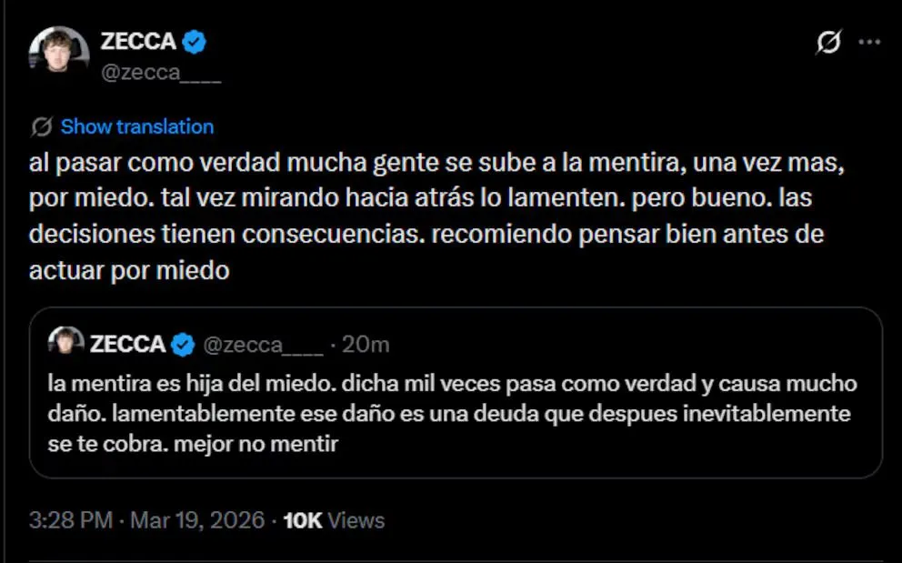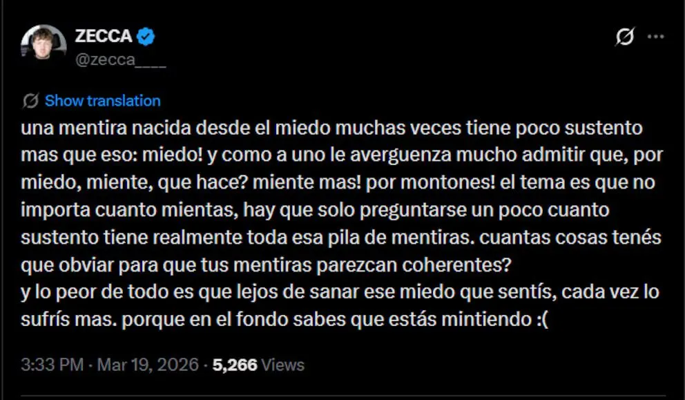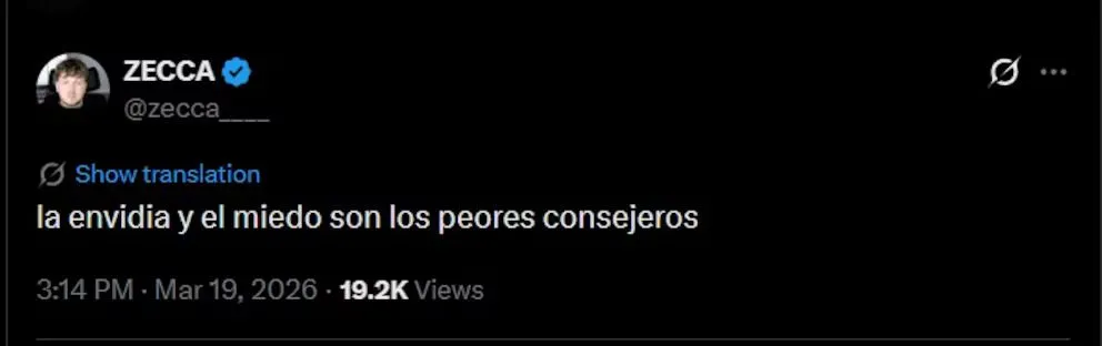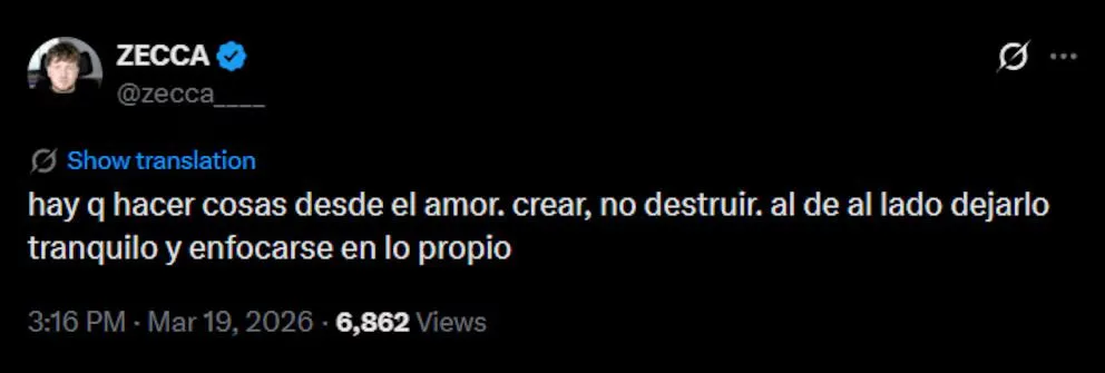 En ese contexto, Zecca eligió pronunciarse con frases cargadas de significado. “La envidia y el miedo son los peores consejeros”, escribió en uno de sus primeros posteos, marcando el tono de una serie de publicaciones que apuntaron a emociones negativas como motor de los conflictos. El productor profundizó su postura con nuevos mensajes: “Hay que hacer cosas desde el amor. crear, no destruir. Al de al lado dejarlo tranquilo y enfocarse en lo propio”.