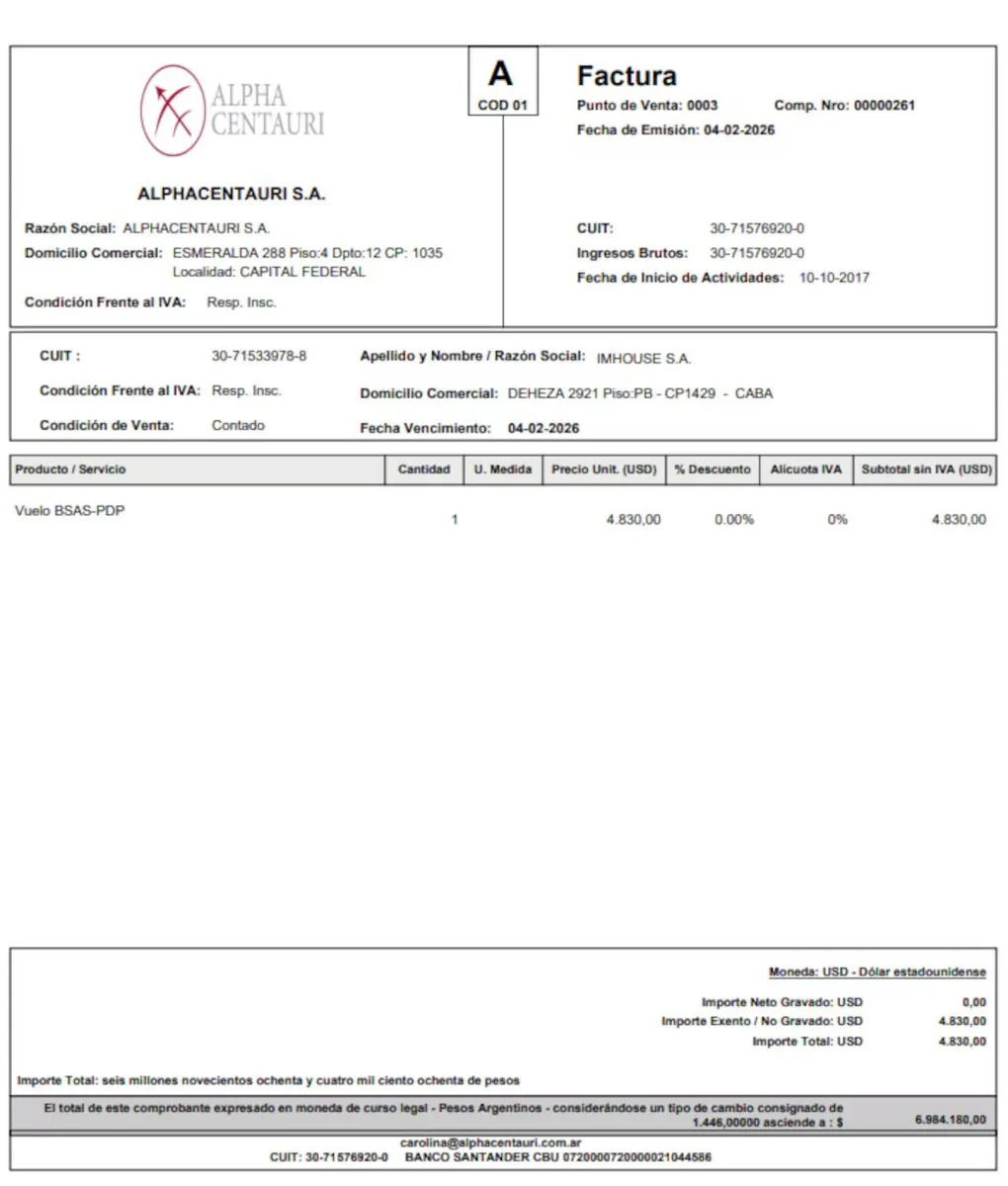 Se trata de la firma Imhouse S.A., donde figura como accionista el periodista Marcelo Grandio, cercano al funcionario. El pago, de acuerdo a la factura, se realizó mediante una transferencia bancaria en pesos por $6.984.180, equivalente a unos 4830 dólares al momento de la operación.