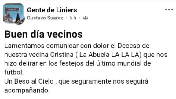 Dolor en Liniers: murió la "Abuela lalala", la jubilada que se hizo viral en el Mundial 2022