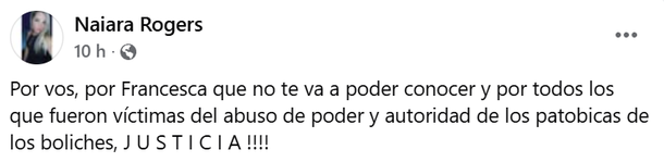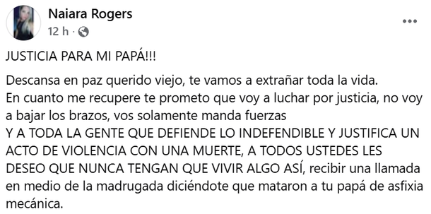 Alexis Oscar “Pipa” Rogers, de 51 años, fue asesinado durante un feroz enfrentamiento con patovicas en el bar Sutton en la localidad de Bella Vista, partido bonaerense de San Miguel. La hipótesis inicial indica que la causa de muerte podría haber sido por asfixia mecánica. Su hija lo despidió con dolorosos mensajes y exige justicia. En la madrugada del sábado, “Pipa” Rogers había asistido al bar junto a su hijo de 23 años y un amigo a celebrar el nacimiento de su nieta. Por motivos que son materia de investigación, se produjo una pelea entre la víctima y persona de la seguridad del local que culminó en tragedia. El hombre, que trabajaba como técnico escénico y era muy querido por sus colegas, fue despedido con conmovedores mensajes en redes sociales, entre ellos los de su hija, Naiara, quien exigió que se esclarezca el caso: “Quiero justicia por mi papá, no se merecía morir de esta forma tan horrible”, escribió la joven. Naiara publicó una serie de mensajes en los que no solo despidió a su padre, sino que exigió que se investigue a los patovicas detenidos. “Por vos, por Francesca que no te va a poder conocer y por todos los que fueron víctimas del abuso de poder y autoridad de los patovicas de los boliches. ¡Justicia!”, expresó en una de las publicaciones. “Descansá en paz querido viejo, te vamos a extrañar toda la vida. En cuanto me recupere te prometo que voy a luchar por justicia, no voy a bajar los brazos, vos solamente manda fuerzas”, indicó en otra y agregó: “A toda la gente que defiende lo indefendible y justicia un acto de violencia con una muerte, les deseo que nunca tengan que vivir algo así, recibir una llamada en medio de la madrugada diciéndote que mataron a tu papá de asfixia mecánica”.