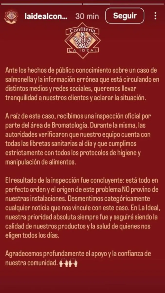 En medio de la polémica, el local quedó bajo la lupa y fue clausurado de manera preventiva. Sin embargo, desde la confitería rechazaron cualquier tipo de responsabilidad y aseguraron que “todo está en perfecto orden”, en referencia a las condiciones de higiene y manipulación de los productos.