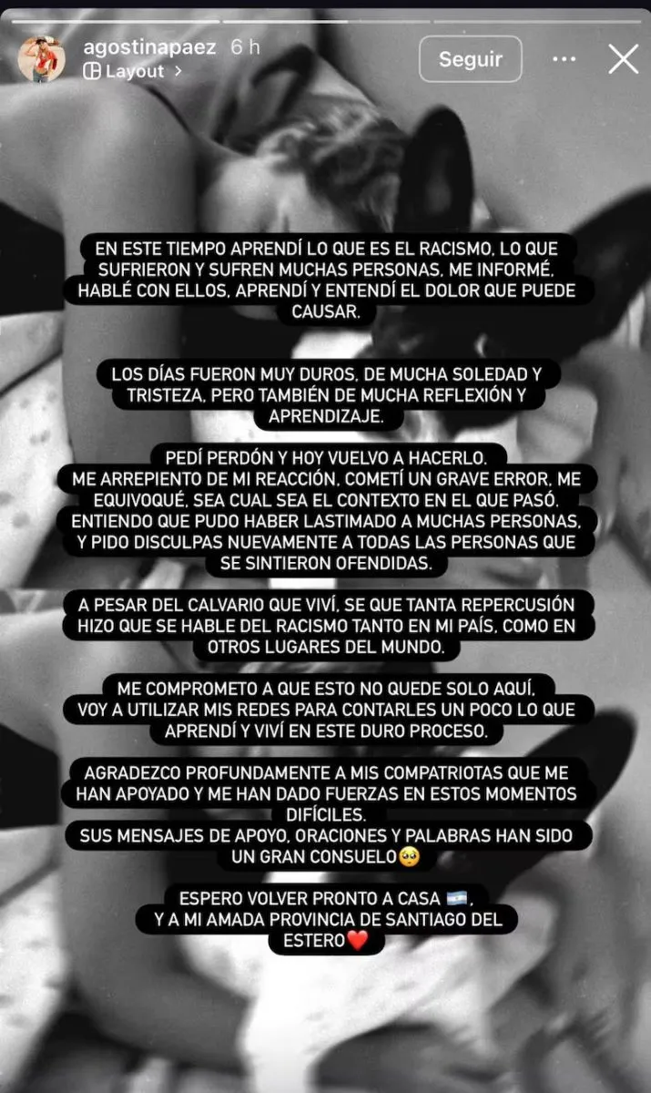 En línea con lo que había declarado a la prensa luego de salir de los tribunales brasileños, Páez escribió: “En este tiempo aprendí lo que es el racismo, lo que sufrieron y sufren muchas personas, me informé, hablé con ellos, aprendí y entendí el dolor que puede causar”.