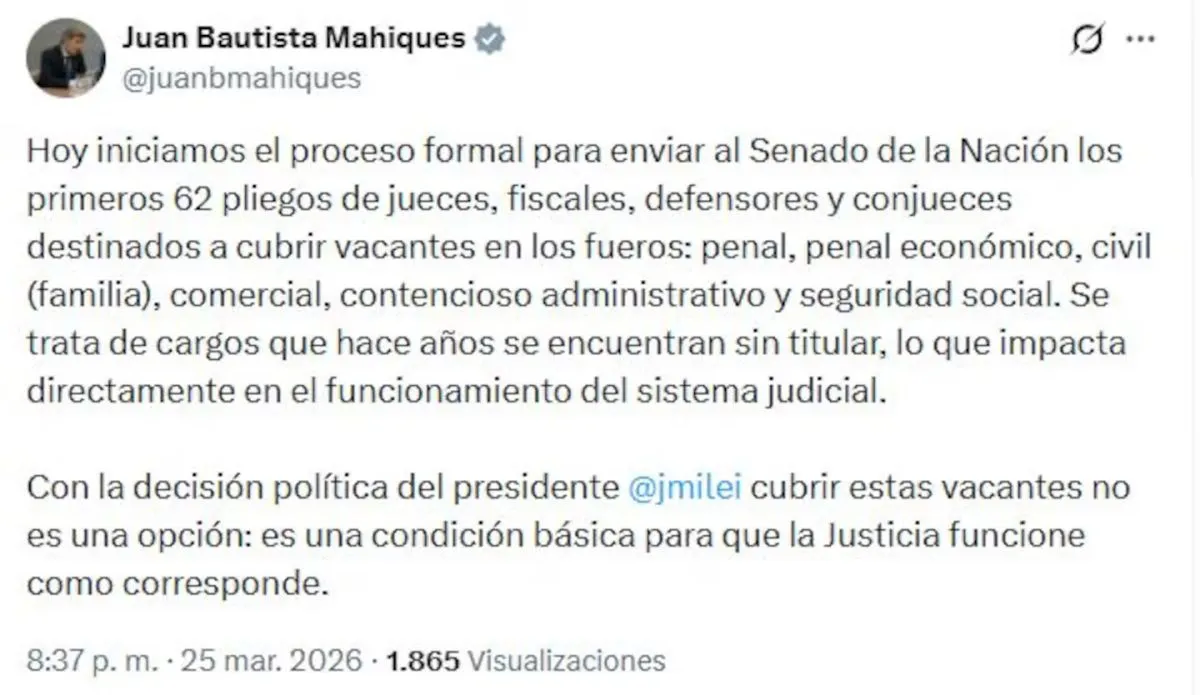 El anuncio fue realizado por el ministro de Justicia, Juan Bautista Mahiques, quien precisó que los nombramientos abarcan áreas como el fuero penal, penal económico, civil, comercial, contencioso administrativo y seguridad social. “Hoy iniciamos el proceso formal para enviar al Senado de la Nación los primeros 62 pliegos de jueces, fiscales, defensores y conjueces destinados a cubrir vacantes”, señaló.