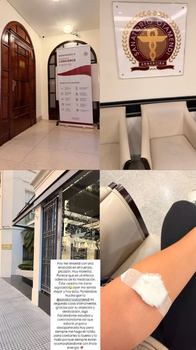 Según contó en sus redes sociales, todo comenzó con una reacción repentina al despertar. “Hoy me levanté con una erupción en el cuerpo, picazón, muy molesta”, explicó, describiendo el malestar que la llevó nuevamente a consultar con médicos en el centro de salud donde sigue su evolución.