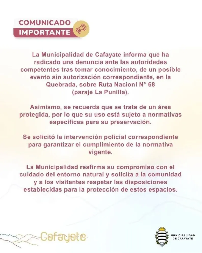 "La Municipalidad reafirma su compromiso con el cuidado del entorno natural y solicita a la comunidad y a los visitantes respetar las disposiciones establecidas para la protección de estos espacios", concluye en su posteo la Municipalidad de Cafayate.