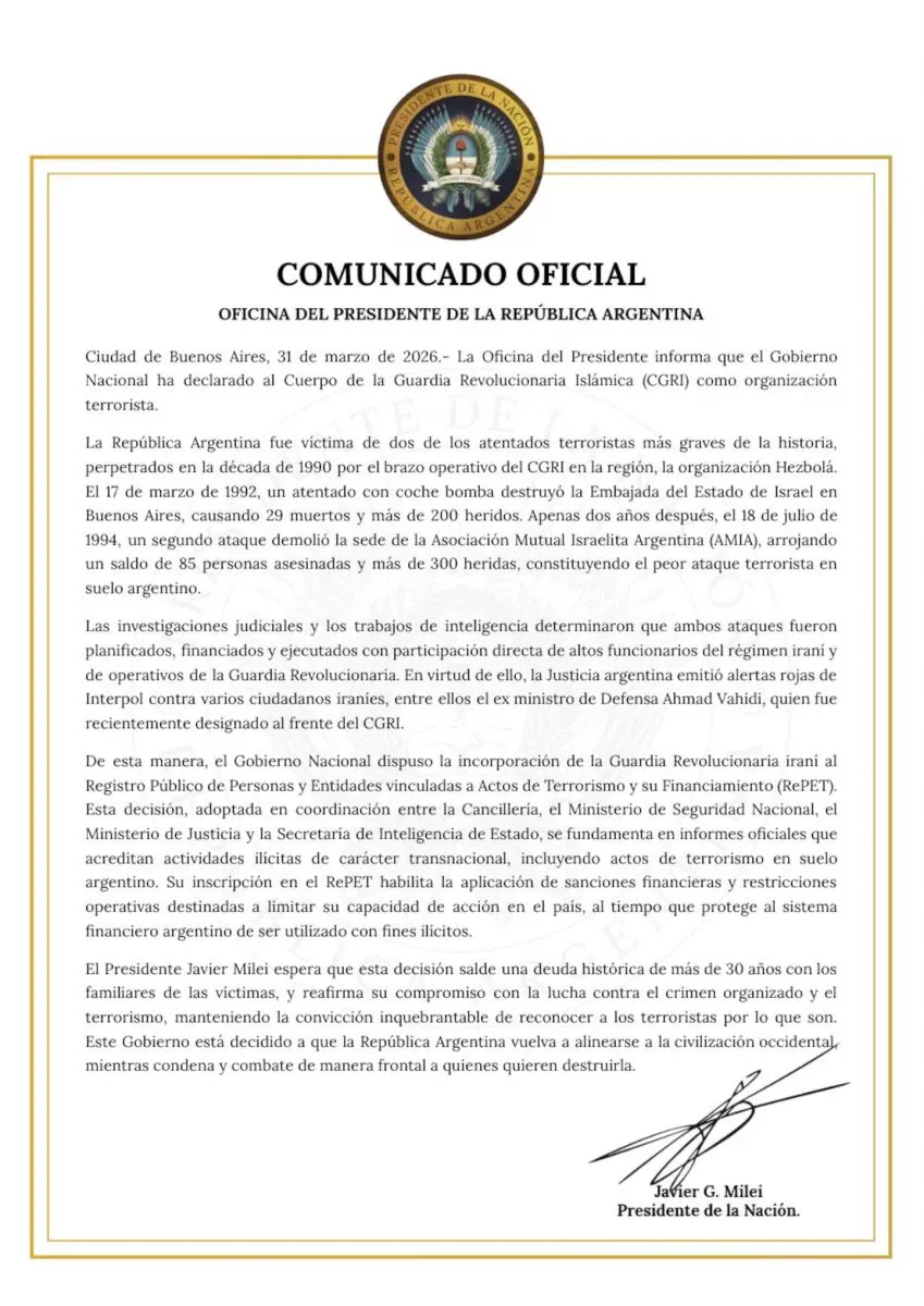 A través de un comunicado, la Oficina del Presidente recordó que la Argentina “fue víctima de dos de los atentados terroristas más graves de la historia”, en referencia a los ataques contra la Embajada de Israel y la AMIA. En ese sentido, sostuvo que “las investigaciones judiciales y los trabajos de inteligencia determinaron que ambos ataques fueron planificados, financiados y ejecutados con participación directa de altos funcionarios del régimen iraní y de operativos de la Guardia Revolucionaria”.