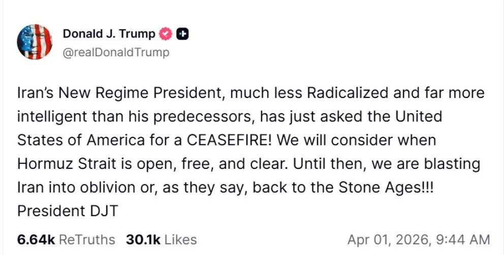 En su red Truth Social, el presidente estadounidense fue más allá y lanzó una advertencia contundente: “El nuevo presidente del régimen iraní, mucho menos radicalizado y mucho más inteligente que sus predecesores, acaba de pedir un alto el fuego a los Estados Unidos de América. Lo consideraremos cuando el estrecho de Ormuz esté abierto, libre y despejado. Hasta entonces, ¡estaremos bombardeando a Irán hasta la aniquilación o, como dicen, de vuelta a la Edad de Piedra!”.