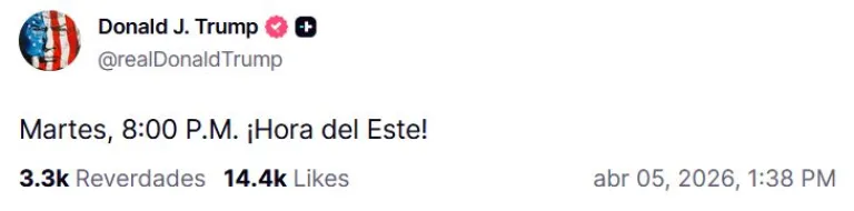 El presidente de Estados Unidos, Donald Trump, volvió a tensar el escenario internacional con un mensaje breve pero cargado de significado en Truth Social: “Tuesday, 8:00 P.M.” (“Martes, 8 P.M.”). La publicación apareció luego de una serie de advertencias contra Irán y fue leída como la confirmación final de su amenaza.