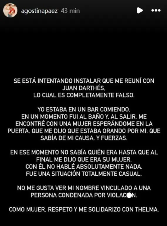 “Se está intentando instalar que me reuní con Juan Darthes, lo cual es completamente falso”, escribió en sus historias, donde dio su versión de los hechos. Según detalló, todo ocurrió mientras estaba en un bar, en una situación que definió como casual.