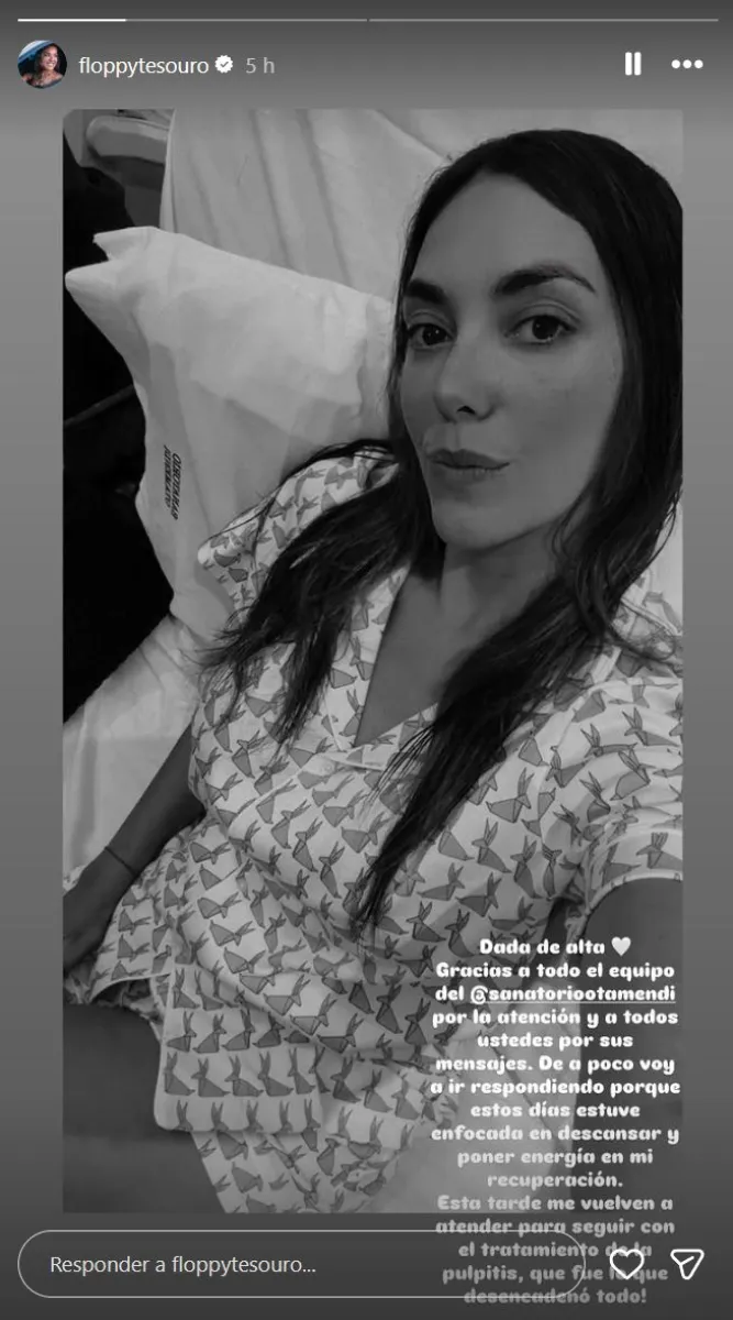 Con el alta ya confirmada, Tesouro compartió un mensaje de agradecimiento y alivio: “Dada de alta. Gracias a todo el equipo del @sanatoriootamendi por la atención y a todos ustedes por sus mensajes”. Además, aclaró: “De a poco voy a ir respondiendo porque estos días estuve enfocada en descansar y poner energía en mi recuperación”.