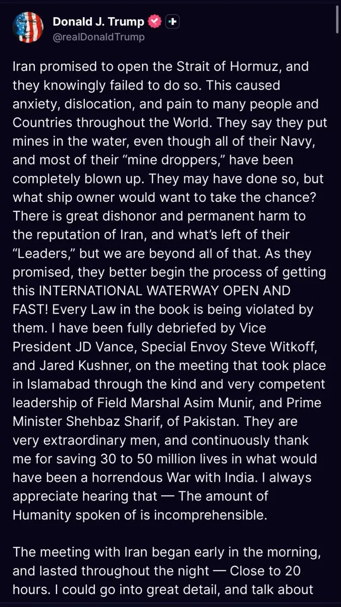 Trump reveló que fue informado en detalle por su equipo más cercano, incluyendo al vicepresidente JD Vance, el enviado especial Steve Witkoff y Jared Kushner. También destacó una reunión clave en Islamabad, en la que participaron el mariscal de campo Asim Munir y el primer ministro Shehbaz Sharif.