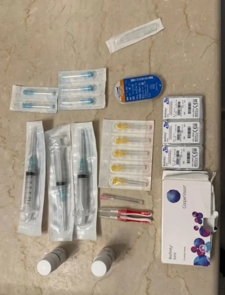 Según consta en el expediente, en el departamento se encontraron ampollas, envases médicos, cajas con insumos y bolsas rotuladas como material incautado, además de dispositivos electrónicos como un celular, una notebook y un CPU.
