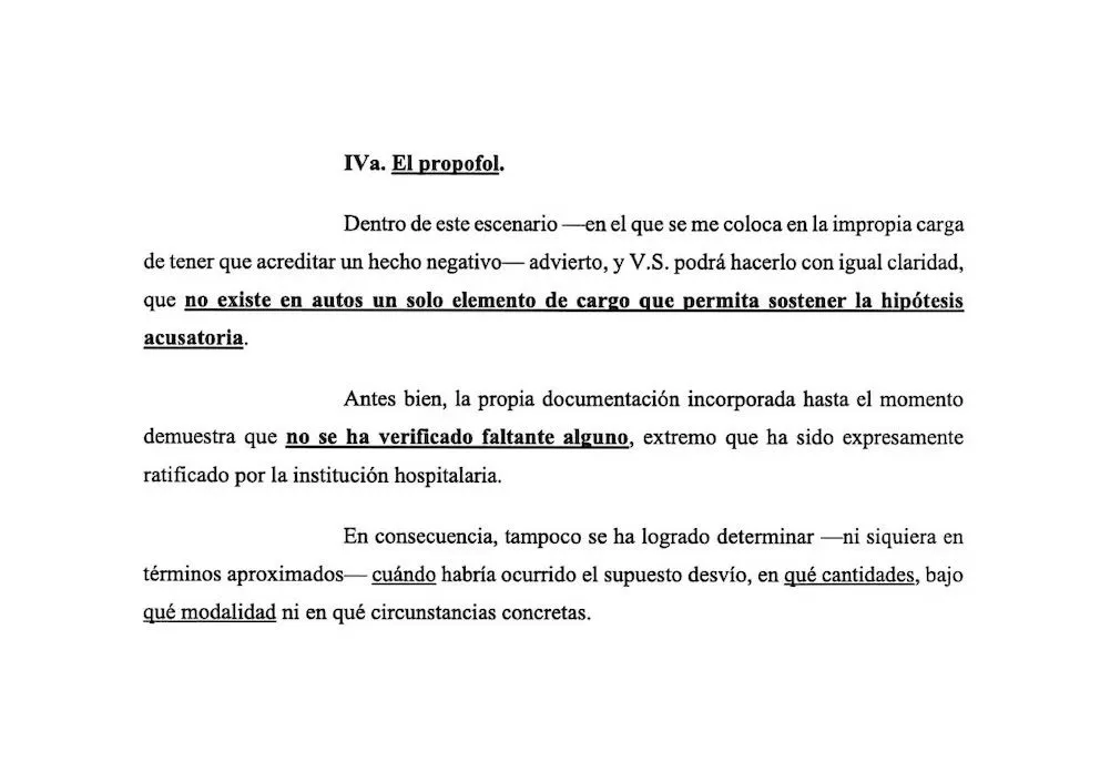 En esa línea, Boveri subrayó que no existe delito en la tenencia de ese material y que su presencia fue interpretada de manera errónea en el marco de la investigación. A su vez, reiteró que no hay pruebas que acrediten el faltante de propofol en el hospital, por lo que consideró que toda la causa se construyó sobre “suposiciones y testimonios indirectos”.