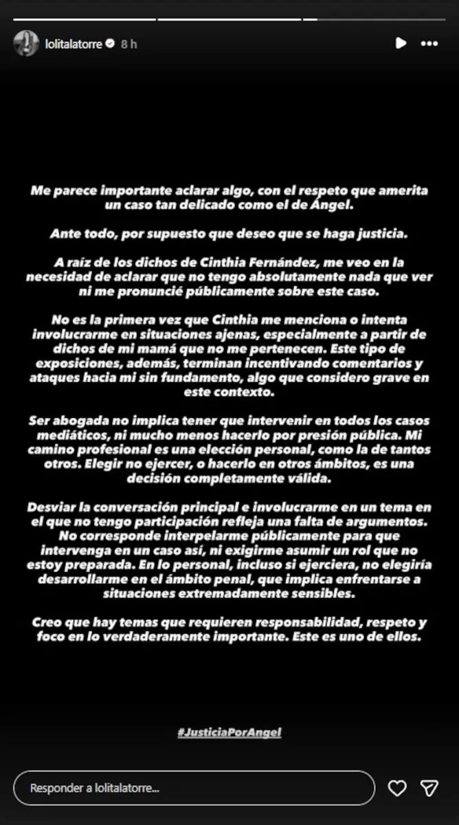 “Me parece importante aclarar algo, con el respeto que amerita un caso tan delicado como el de Ángel”, expresó en un primer mensaje, donde también dejó en claro su deseo de que el hecho se esclarezca: “Ante todo, por supuesto que deseo que se haga justicia”.
