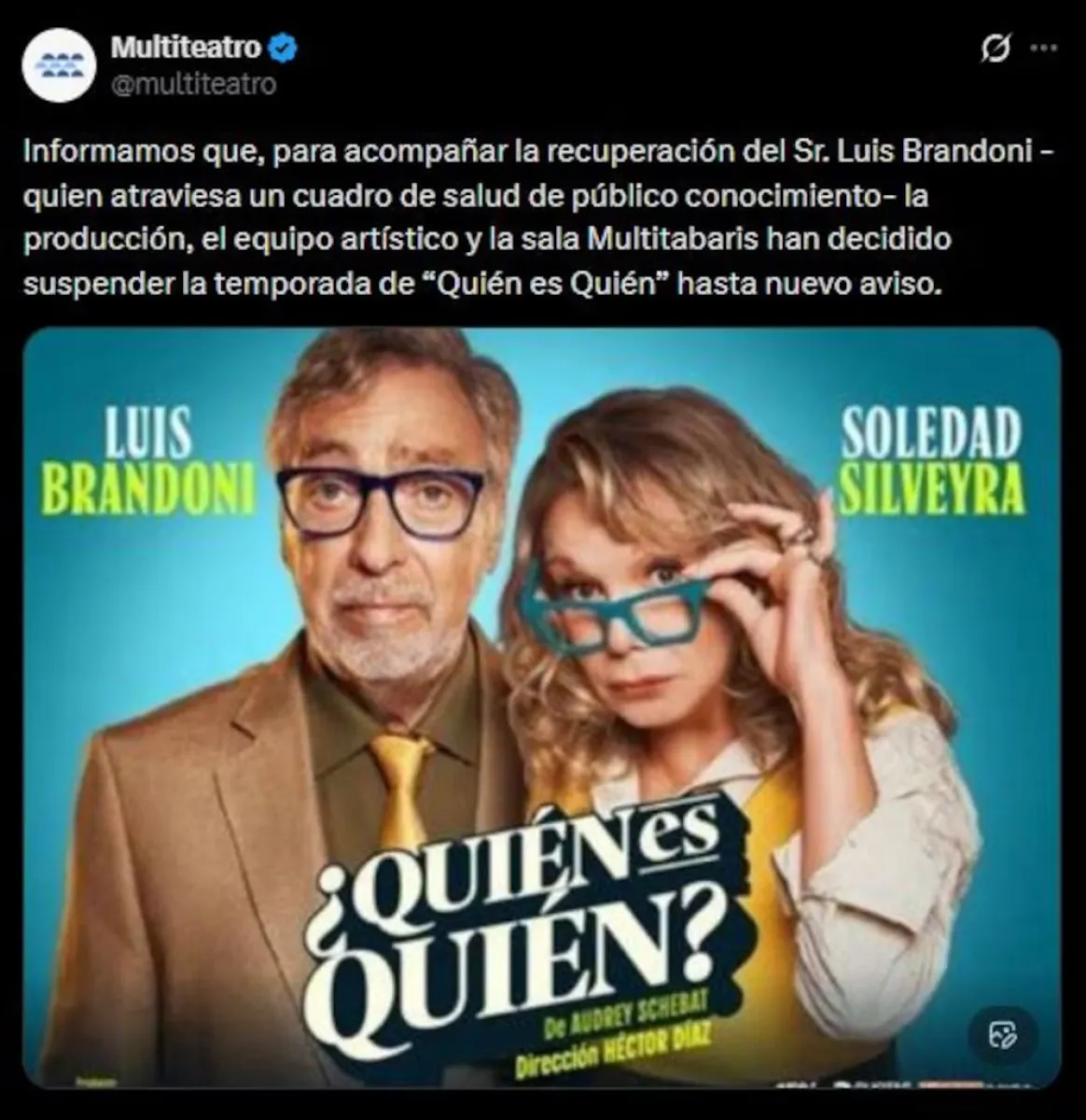 A raíz de esta situación, la producción decidió suspender la temporada teatral de Quién es quién hasta nuevo aviso, mientras el actor continúa con su evolución y seguimiento médico.