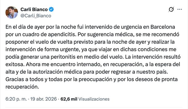 El funcionario se encuentra fuera de peligro y en etapa de recuperación. Bianco dio a conocer la noticia a través de sus redes sociales, donde explicó que la operación se realizó el sábado por la noche.