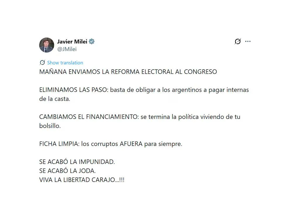 “MAÑANA ENVIAMOS LA REFORMA ELECTORAL AL CONGRESO. ELIMINAMOS LAS PASO: basta de obligar a los argentinos a pagar internas de la casta. CAMBIAMOS EL FINANCIAMIENTO: se termina la política viviendo de tu bolsillo. FICHA LIMPIA: los corruptos AFUERA para siempre”, publicó el mandatario, y remató: “SE ACABÓ LA IMPUNIDAD. SE ACABÓ LA JODA. VIVA LA LIBERTAD CARAJO...!!!”.