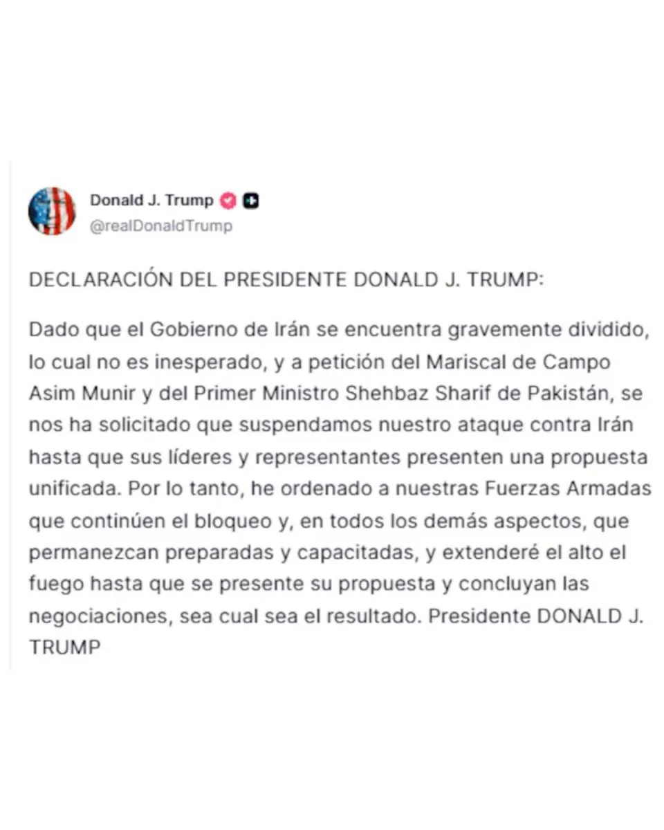 “He dirigido a nuestras Fuerzas Armadas para que continúen el bloqueo y, en todos los demás aspectos, permanezcan listas y capacitadas, y extenderé el alto el fuego hasta que se presente su propuesta y concluyan las negociaciones, sea cual sea el resultado”, expresó el mandatario a través de sus redes sociales.