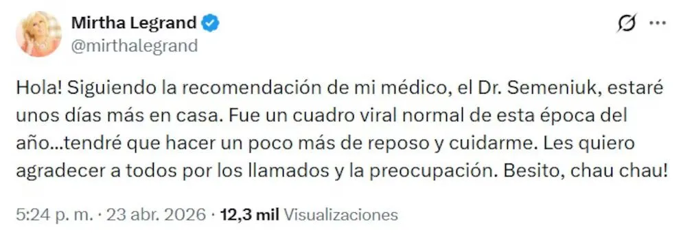 “¡Hola! Siguiendo la recomendación de mi médico, el Dr. Semeniuk, estaré unos días más en casa”, expresó la histórica figura de la televisión, dejando en claro que su decisión responde exclusivamente a cuestiones de salud. Además, detalló: “Fue un cuadro viral normal de esta época del año… tendré que hacer un poco más de reposo y cuidarme”.