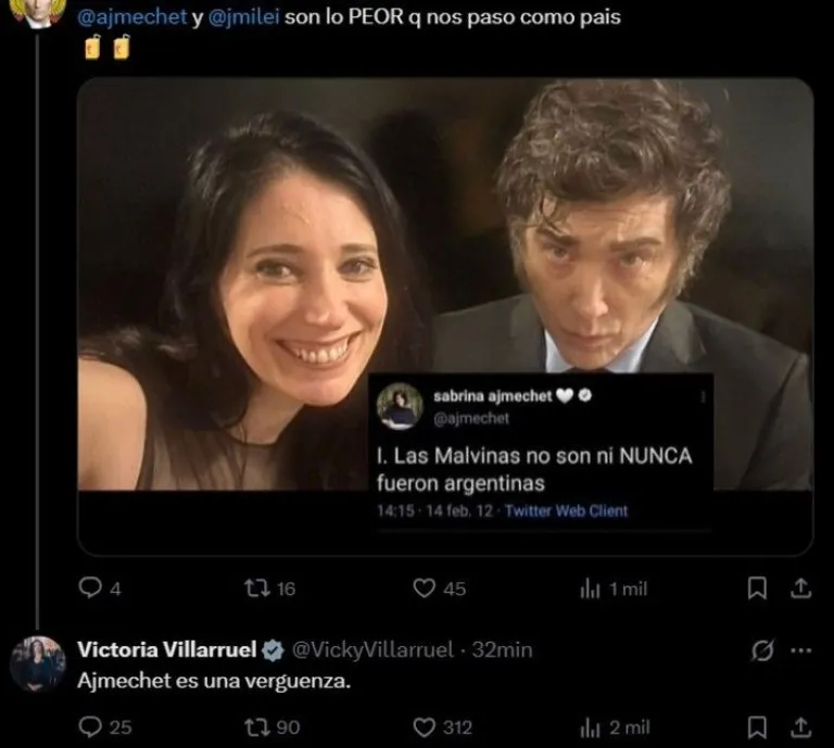 Todo comenzó cuando Villarruel calificó como “una vergüenza” a la legisladora, luego de que resurgiera un antiguo tuit de 2012 en el que Ajmechet afirmaba que “las Malvinas no son ni nunca fueron argentinas”. El comentario de la titular del Senado se dio en medio de interacciones con usuarios en la red social X, pero rápidamente escaló a un enfrentamiento directo.