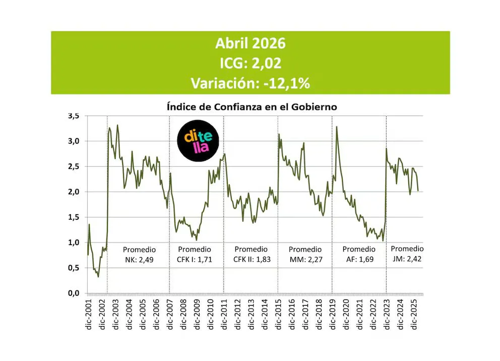 El índice de Confianza en el Gobierno (ICG), elaborado por la Universidad Torcuato Di Tella, volvió a mostrar una caída en abril y confirmó una tendencia negativa que ya lleva cuatro meses consecutivos. Según el informe, el retroceso fue del 12,1% respecto de marzo, el descenso más pronunciado en lo que va del año.