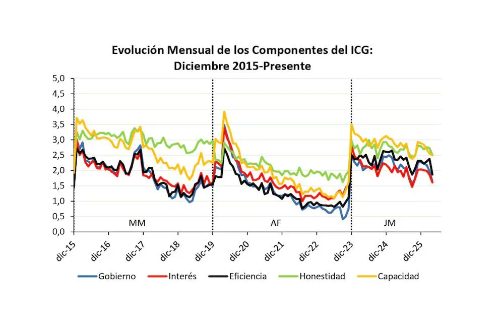 El análisis por componentes muestra que todos los ítems evaluados registraron retrocesos durante el mes. Entre ellos, el rubro de eficiencia fue el más afectado, con una caída del 21,4%, seguido por la evaluación general del Gobierno y la percepción sobre el interés público.